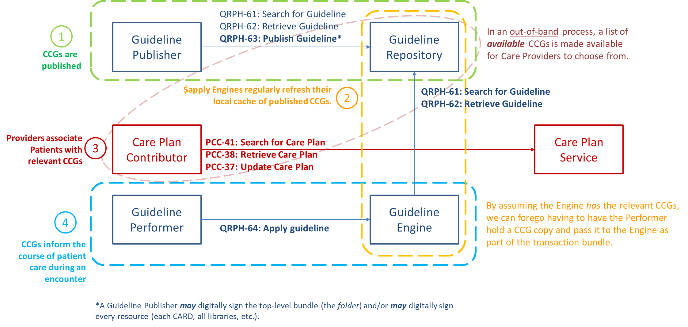Note 3: a Guideline Engine that supports the Trusted CCG Option will evaluate CCGs returned by transaction QRPH-62 to ensure the artifacts are signed by trusted parties and that they have not been tampered with (see below).